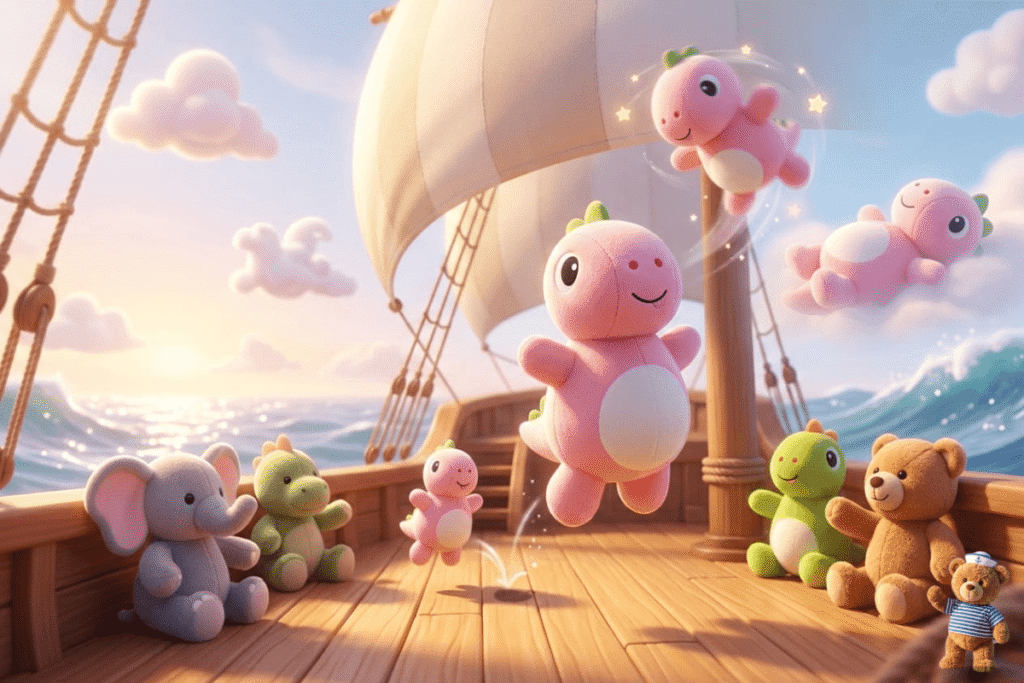 Greenasaur the dinosaur loved to stomp. Not loud stomps.Happy stomps. One bright day, Greenasaur the dinosaur marched across the deck. Stomp… stomp… stomp… The ropes wiggled.The sails swayed.The toys followed behind. It became a parade. Captain Ted tapped the wheel … Readmore