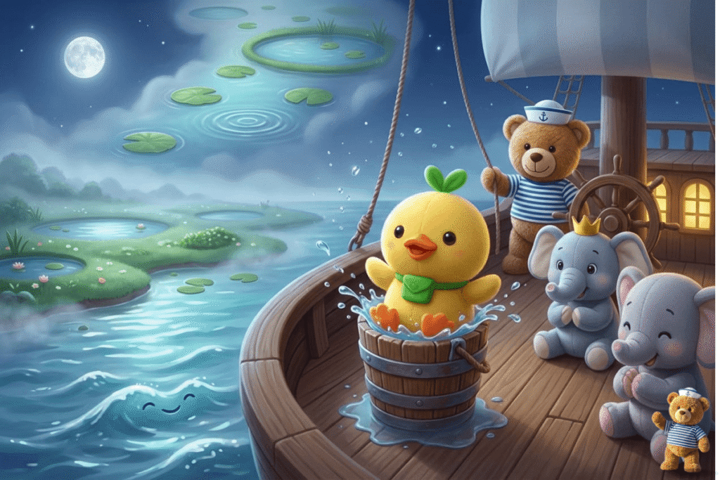 Quack the duck loved water. Real water.Shiny water.Pond water. As Toyship sailed past a land of little ponds, the breeze carried the smell of fresh rain and ripples. Quack the duck waddled to the edge and flapped tiny wings. “Quack, … Readmore