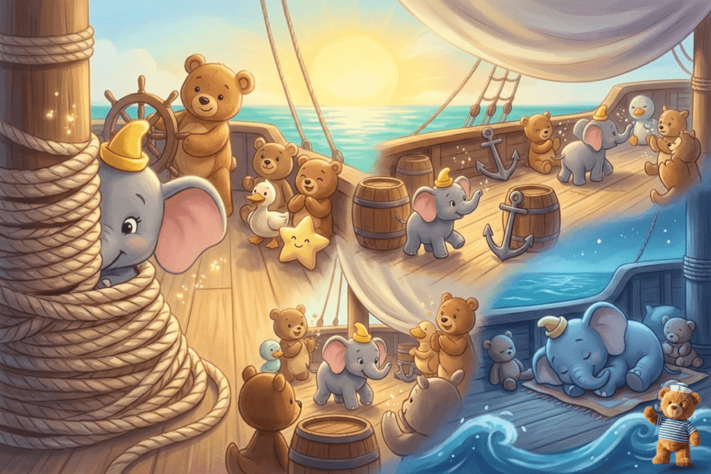 When the sea grew wavy and the wind whooshed a little louder, some toys came close to Blossom the elephant.