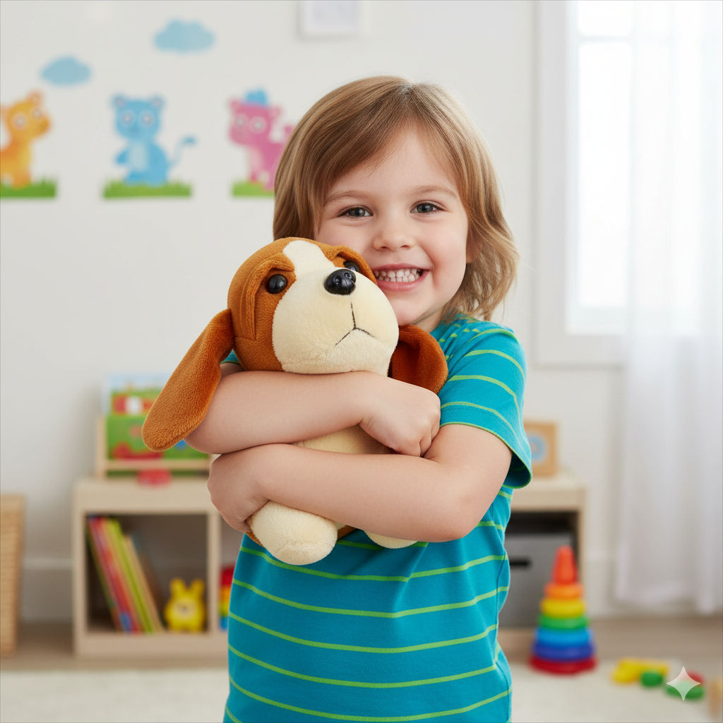 Adorable soft dog plush for kids 2+. Gentle, huggable, and perfect for cuddles, playtime, and everyday comfort.